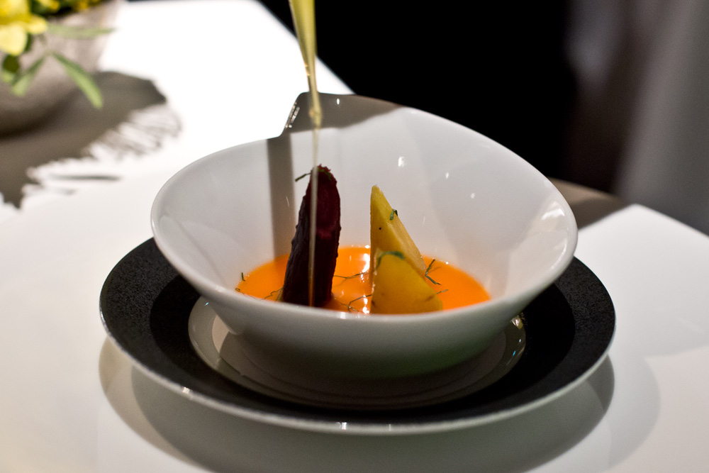 Der erste Gang unseres Menüs ist gleich ein hervorragendes Gericht. Die Gelbschwanzmakrele ist eine Wucht. Kombiniert wird der leicht gegarte Fisch mit Erbsenpüree, gepickeltem Kürbis, einem Hauch von Erdnüssen sowie einem wuchtigen aber niemals aufdringlichen Sojapüree. Perfekt dosiert sind aber auch die angenehme Schärfe, und das erfrischende Limettenaroma. Wie man die Komponente auf dem Teller auch kombiniert, das Ergebnis begeistert durch und durch. Als wäre das Glück nicht gross genug, gibt es als Krönung warme Spargeln in einer Mais-Kruste, die nicht nur himmlisch duften, sondern auch unvergesslich gut schmecken.