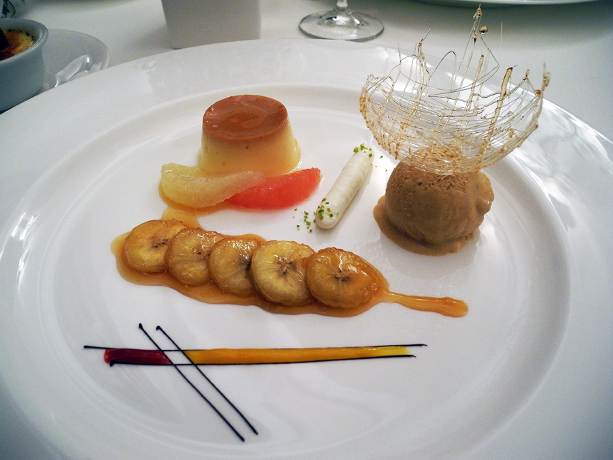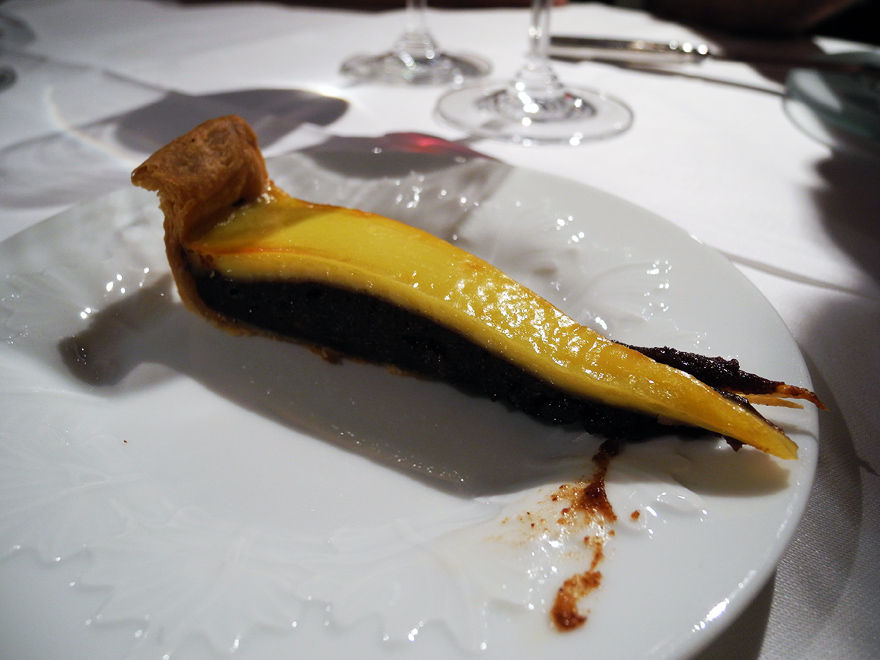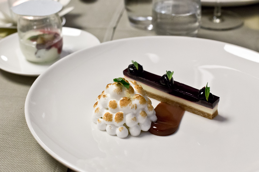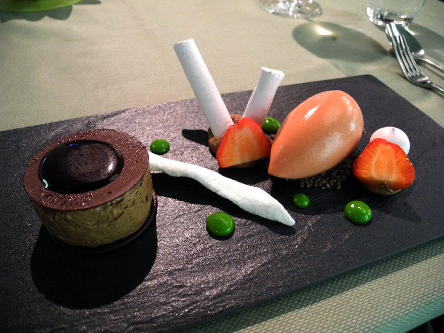 Als Dessert wählen wir das Schokoladentörtchen aus der „Klassiker“- Karte. Dieses erinnert uns an Peter Gilmores Kreation, auch hier wird am Tisch etwas heisse Schokoladensauce über das Dessert geleert. Wegen einer kleinen Fehlkonstruktion bildet sich bei unserem Törtchen aber keine Einbuchtung. Egal. Geschmacklich ist es genau so wuchtig wie in Sydney, obwohl das Original, Dank den zusätzlichen Texturen, einiges spannender schmeckte. Dennoch gefällt uns dieses Dessert hier besser. Die Früchte und vor allem das geniale Erdbeereis, geben dieser Kreation eine viel bessere Balance.
