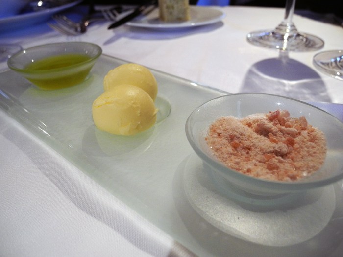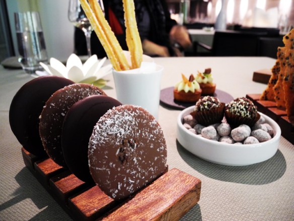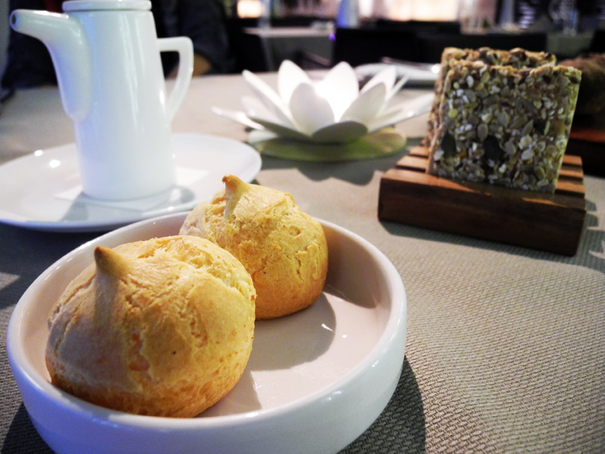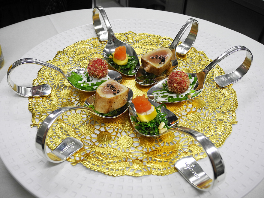 Während wir noch über der Speisekarte brühten und mit der Auswahl unserer 8 Gänge beschäftigt sind, erhalten wir als kulinarische Einstimmung ein paar Apéro-Häppchen.