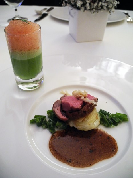 Ein sehr fleischiges und abwechslungsreiches Gericht wird uns als nächstes geschickt. Die Ente ist kross gebraten, zart und dazu serviert man uns diesen stimmigen Entenjus. Die Höhepunkte sind zum einen die erstklassige Entenleber, welche perfekt zubereitet ist und zum anderen das Enten-Schalottenkonfit, welches schlicht atemberaubend schmeckt. Ganz stark! Einzig der Pfirsich wirkt in dem Gericht etwas deplatziert.