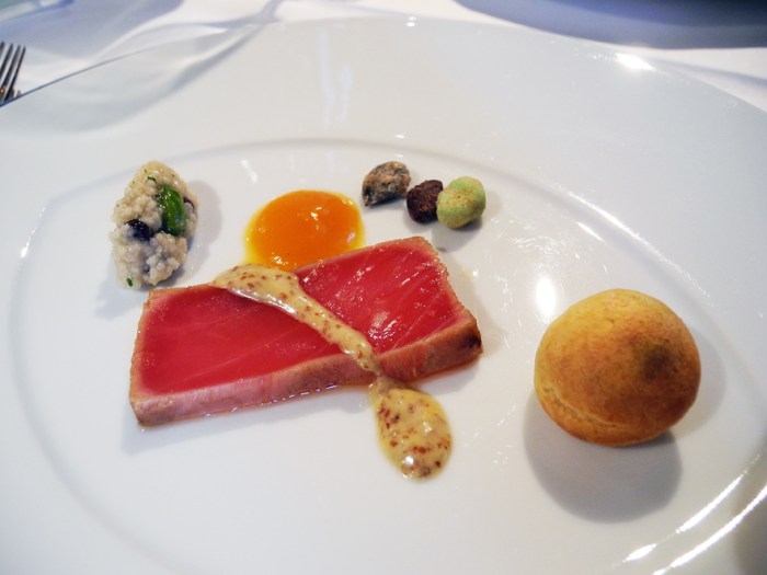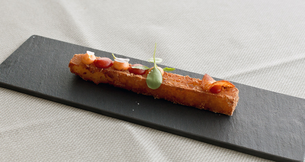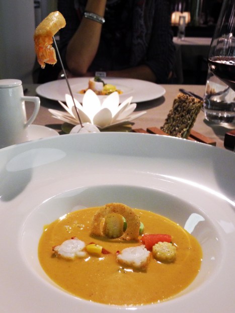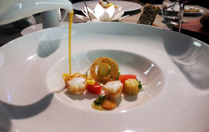 Die Präsentation der Suppe gefällt uns sehr gut. Wie bereits damals im ‚Château Gütsch‘ wird sie auch hier, erst am Tisch vollendet. Die kalte Maissuppe schmeckt zwar eher nach Curry – macht uns mit diesem Aroma aber genau so glücklich. Der eigentliche Maisgeschmack kommt dann durch die kleinen Maiskolben ins Spiel – diese schmecken wider erwartet sehr intensiv. Ebenfalls ganz stark die Scampi aus Südafrika, welche von allerhöchster Qualität sind. Als kleines Extra gibt es nochmals einen im Tempura, auf einem Spiess.