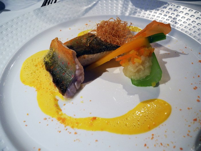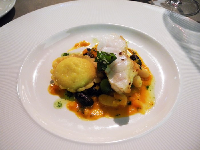 Die Show geht weiter. Auf dem Teller liegt eine wunderbare Entenleber-Terrine, welche als sauren Gegenpool, einen Hauch von Granny Smith-Gelée eingebettet hat. On top ein zart schmelzendes Entenleber-Mousse. Dieses zergeht auf der Zunge und gibt dieses einzigartige Aroma frei. Rund um das Gericht sorgen Apfel und Balsamico-Apfel Tupfer für die Säure und Süsse – sehr stark arrangiert. Zu guter Letzt auch ein grosses Lob an das Brioche, welches klar zu den Besten gehört, die wir jemals geniessen durften.