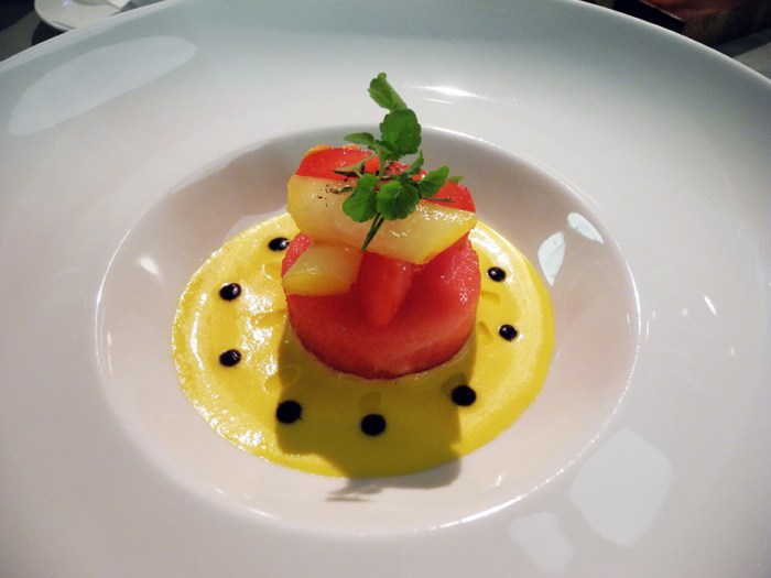 Hier ist die gelbe Melonen-Suppe der heimliche Star. Uns gefällt wie sie lediglich mit etwas Olivenöl abgeschmeckt wurde. Einzig ein Löffel fehlt uns um auch den letzten Tropfen geniessen zu können.
