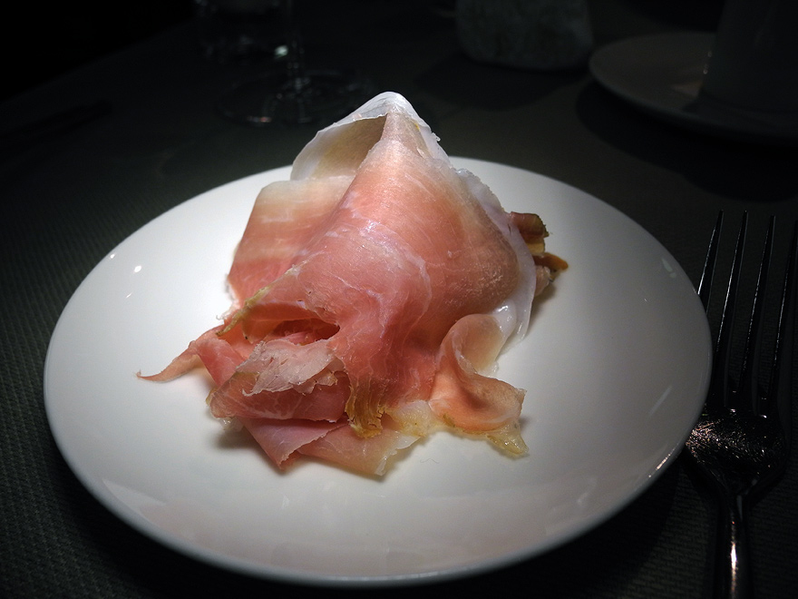 Der Rohschinken vom Molkenschwein wurde für einmal nicht um die Melonen gewickelt, sondern liegt separiert auf einem weiteren Teller. Optisch etwas ungewohnt, doch geschmacklich konnte das hauchdünne und nur leicht mit Pfeffer gewürzte Fleisch sehr überzeugen.