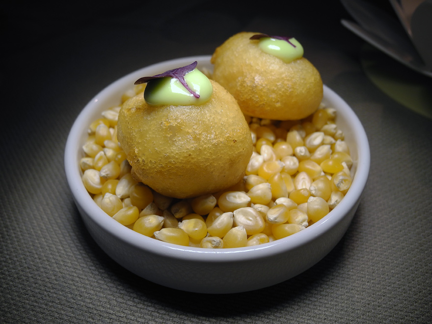 Wir beissen in das frittierte Maispoularde-Bällchen und werden von einer extrem saftigen und zarten Füllung überrascht. Dagegen wirkt jedes vorher gegessene Chicken-Nuggets zäh und fad.