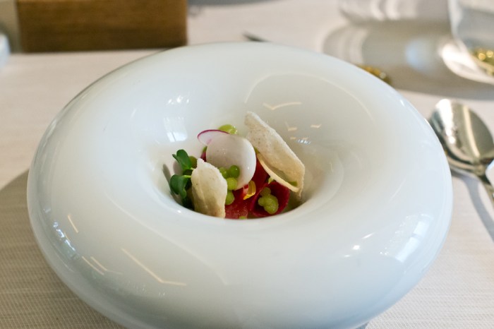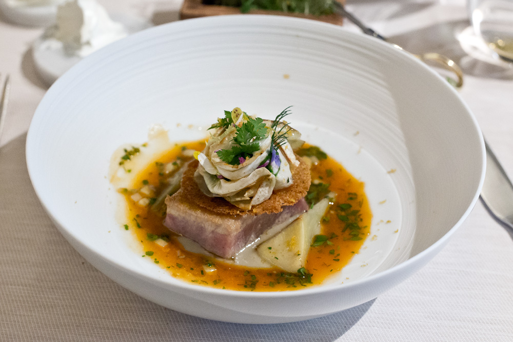 Das mediterrane Amuse Bouche ist eine Wucht und passt perfekt zu diesem lauen Sommerabend inmitten des Giardino-Paradieses. Im geschmacklichen Zentrum ist die Tomate, welche den Geschmack des Sommers in sich trägt. Zum einen in der Form eines kraftvollen Tomaten-Sorbet und zum anderen mit einer ganz starken Tomaten-Vinaigrette, die das ausgezeichnete Gericht umgibt. Dazwischen immer wieder ein kurzes Umami-Aufblitzen dank den Sardellenfilets und dem Parmesanchip. Das Thunfisch-Tatar und -Carpaccio können gegen diese starken Mitakteure keine Akzente setzen und bleiben leider blass. Frische Tomaten hätten das Gericht vermutlich besser erweitert. Dass der Thunfisch doch noch begeistern kann, hat er seinem Bauch zu verdanken. Fliegauf hat den Toro geflämmt und, im Wissen um die starken, säurebetonten Akteure in der Mitte, auf den Tellerrand platziert. Dadurch entfaltet das edle Stück sein volles, unverwechselbares Aroma und fasziniert unglaublich. Überaus glücklich blicken wir auf die Seerosen im Teich und geniessen noch Minuten später den kräftigen und langanhaltenden Geschmack in unseren Mündern.