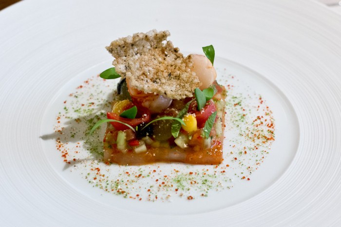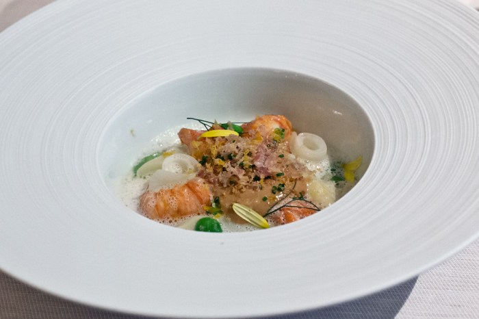 Kaum ist der Krustentier-Sud auf dem Teller angegossen, verbreitet sich am Tisch ein traumhafter Duft. Der Kaisergranat ist von ausgezeichneter Qualität. Bissen für Bissen geniessen wir mit geschlossenen Augen und dem Zirpen der Zikaden in den Ohren. Ebenfalls ausgezeichnet schmeck das knusprige Brickteigröllchen gefüllt mit einem asiatisch abgeschmeckten Kaisergranat-Salat mit perfekt eingebundener Säure.