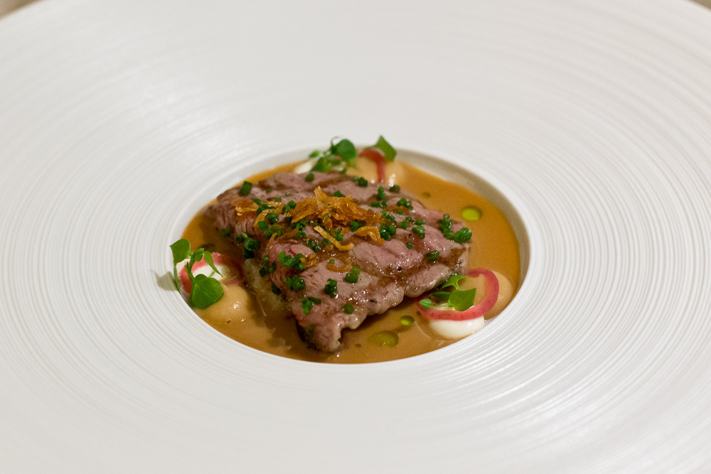 Für den Hauptgang hatten wir zwei Optionen. Wir entschieden uns zu Beginn gegen die Königstaube und für dieses Rind von „Holzen“ aus Ennetbürgen. Es hat sich gelohnt – und wie! Vor uns liegt gerade eines der besten Stück Rindsfleisch, das wir jemals geniessen durften. Das Kotelett verfügt dank der langen Lagerung über einen unglaublich intensiven Eigengeschmack. Das Fett ist ein wahrer Geschmacksträger und bleibt mit seinem nussigen Aroma unvergesslich. Das Fleisch wird mit einer Röstzwiebel-Schnittlauchkruste ergänzt. Der aufgegossene Jus mit Miso und Limette hat eine angenehme, leichte Bitternote und passt hervorragend zum Kotelett. Auch für die Begleitung gibt es grossen Applaus. Zum einen für das wuchtig-intensive Innereien-Sandwich zum anderen für den Tortellini mit herzhaft geschmorter Fleischfüllung. Einzig die Morcheln sind leider ausdruckslos – aber dies kompensiert der wunderbare Caesar Salad mit Leichtigkeit.