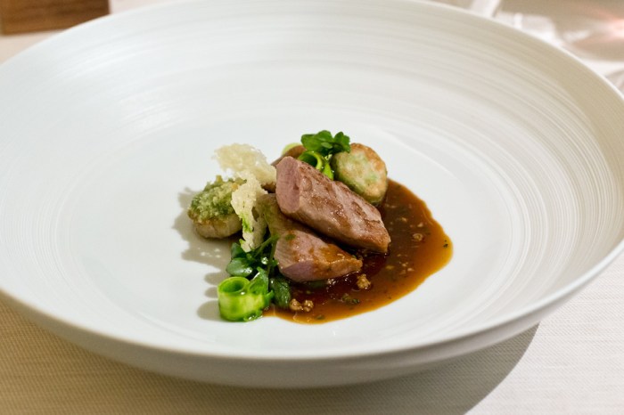 Mit dem Birchermüsli gelingt Rolf Fliegauf ein Geniestreich. Absolut genial wie er mit den verschiedenen Aromen und Texturen ein wohlschmeckendes Gesamtwerk schafft. Im Vordergrund steht die Gänseleber, die mit ihrem wundervollen Geschmack überzeugt. Die Leber finden wir nicht nur als Crème und Terrine, sondern auch als gefrorene Plättchen. Die sorgen für eine erfrischende Note und entfalten ein betörendes Aroma sobald sie auf der Zunge zergehen. Für die knusprige Textur sorgen geröstete Haselnüsse aus dem Piemont und karamellisierte, sehr intensiv schmeckende Cerealien. Stark auch die Hühnerhaut und die perfekt dosierte Säure vom Apfel. Ein hervorragendes Gericht in das man mit grossem Vergnügen den Löffel taucht und darauf jeweils immer eine etwas andere Geschmackswelt findet.