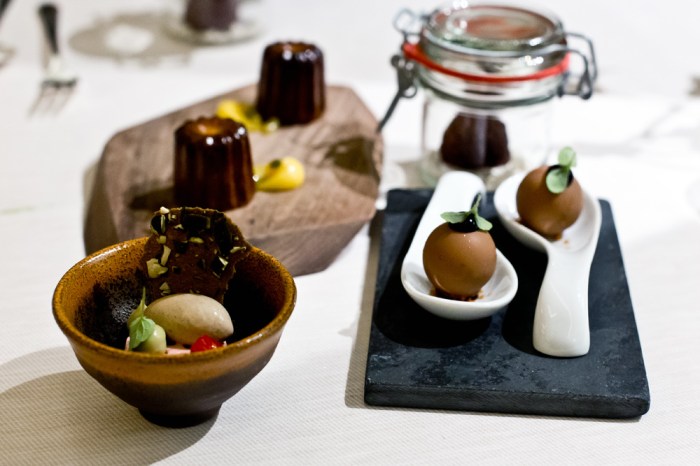 Nun ist die Pâtisserie an der Reihe. Der Süsse Teil wird auf der Karte keck mit einem Hashtag angekündigt. Beim Auftakt gibt es zuerst ein Déjà-vu. Denn die ersten süssen Häppchen werden nicht nur in der gleichen Holzkiste wie der Menü-Auftakt präsentiert, sondern haben auch die gleiche Optik und mit dem Safran ein verwandtes Geschmacksbild.